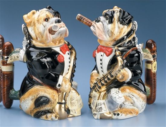 Porcelain, handpainted figural decoration. This stein is the fourth edition in the series entitled Man's Best Friend. By popular demand, we introduce the second Bulldog. This time he is wearing a black tuxedo with red bow tie and cummerbund. He has a red boutonniere on his lapel. He is holding a sax and a beer stein. Sheet music appears near the handle and at his feet. The handle is a cigar with treble clef embossed band. This is a fantastic companion piece to the first Bulldog stein. They will look great together anywhere! Limited edition of 5,000 pieces.