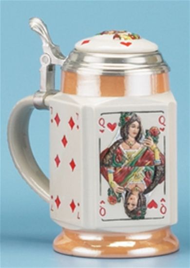 Stoneware, raised-relief decoration. This stein has a rare four-sided shape, and each of the four subject panels is precisely sculpted and handpainted. The Queen of Hearts, Ace of Spades, Jack of Clubs, and Seven of Diamonds are the designs on the panels. A ceramic inlay with a King motif is handpainted and permanently mounted in the pewter lid.