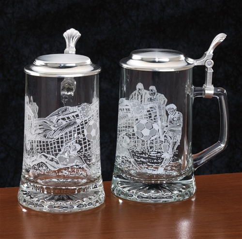 German Glass Soccer Beer Stein with Pewter Lid, Each.