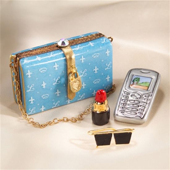 Limoges Blue Elegant Purse Box with Phone, Liptsick and Sunglasses