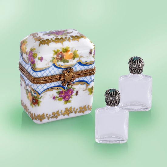 Limoges Traditional Chest with Flowers and Blue Grid and 2 Glass Bottle Boxes
