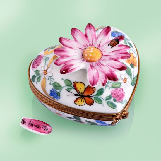 Limoges He Loves Me, He Loves Me Not Heart Box with Pink Daisy and Message
