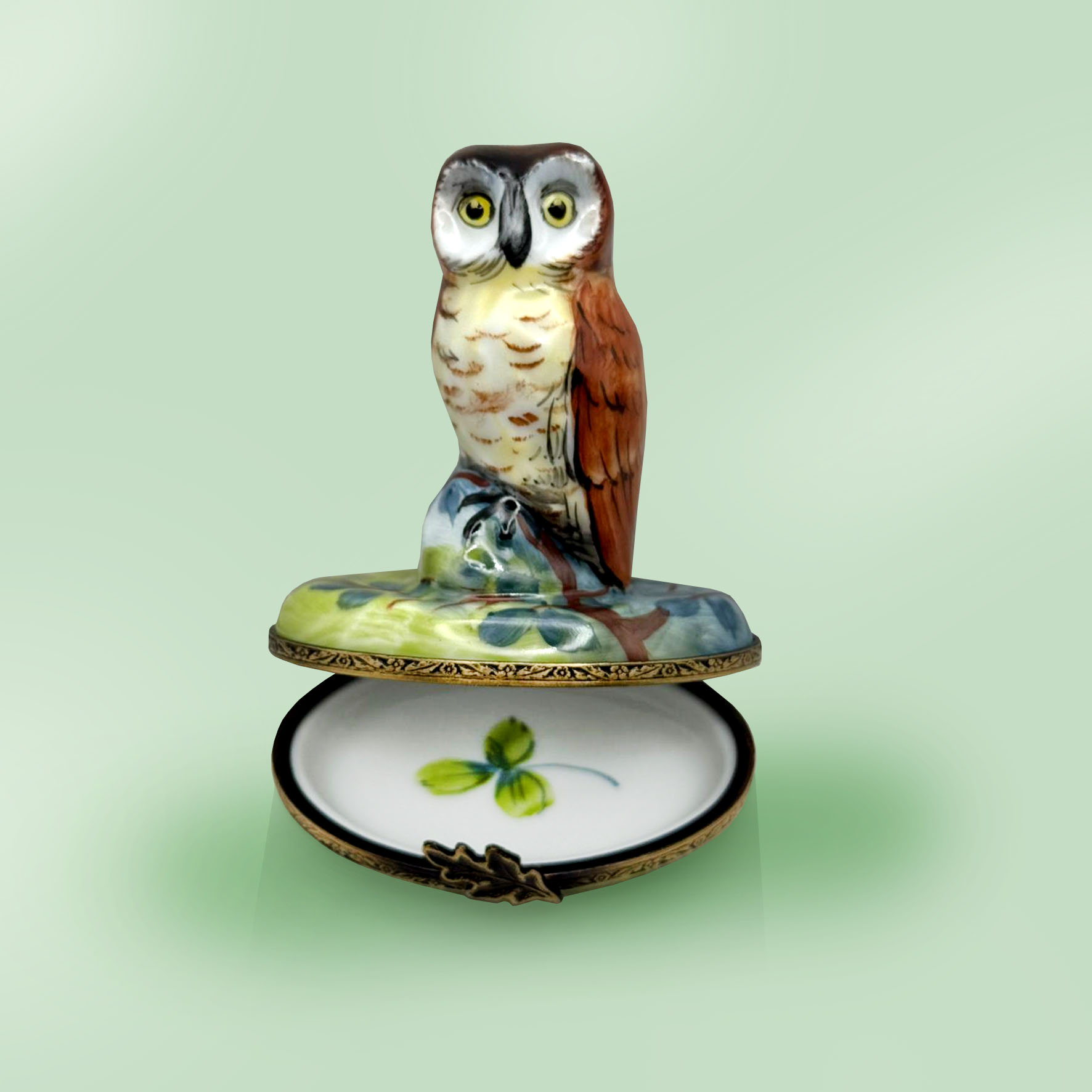 Limoges Owl on Branch with Green Leaves Box