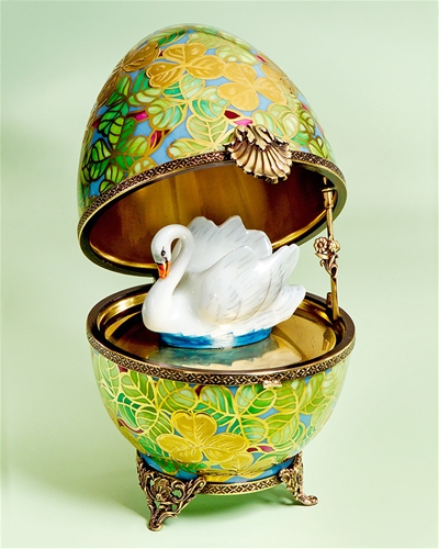 This fine Limoges Faberge style Egg Box with a Swan in a hand painted 24 carat gold base is meticulously hand painted by one of our Limoges museum artists in the city of Limoges, France.